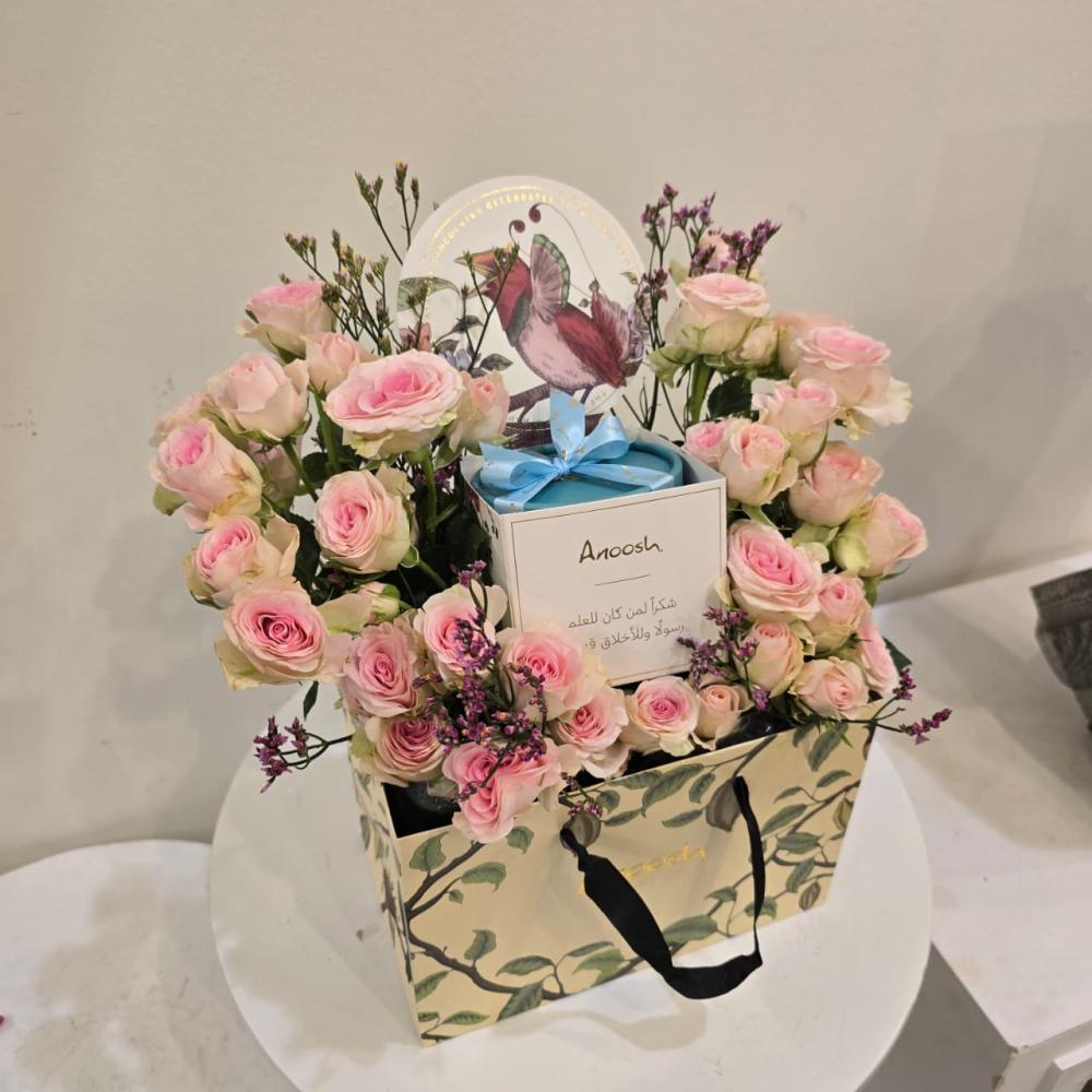 - تصميم جذاب: يجمع بين الورود الوردية الفاتحة والعلبة الأنيقة.