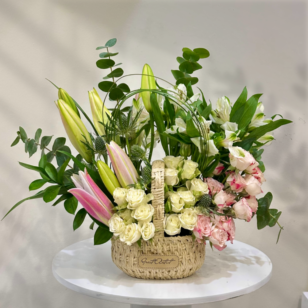 سلة الورد من Pion، الخيار المثالي لكل من يعشق الورود البيضاء الناعمة مع لمسة من البيبي روز وورد الكازا الأنيق.
