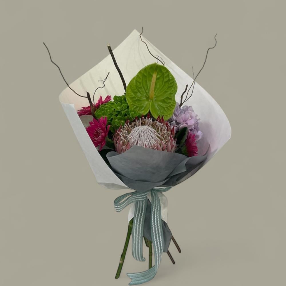 • تنسيق أنيق يجمع بين البروتي، الأنيثيوم، الزنابق والزهور الصغيرة.