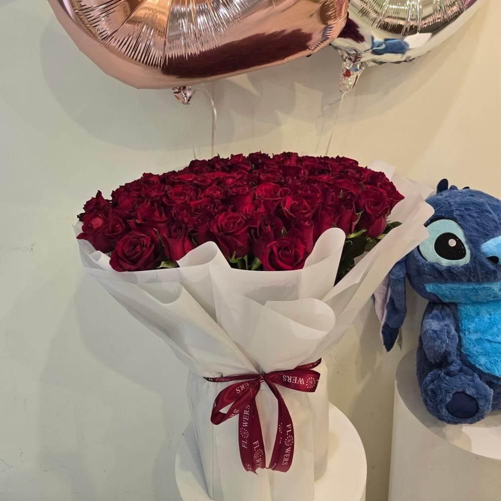 أضف لمسة من الجمال والرومانسية إلى حياتك مع بوكيه كبير أحمر 100 ورده من براند pion.