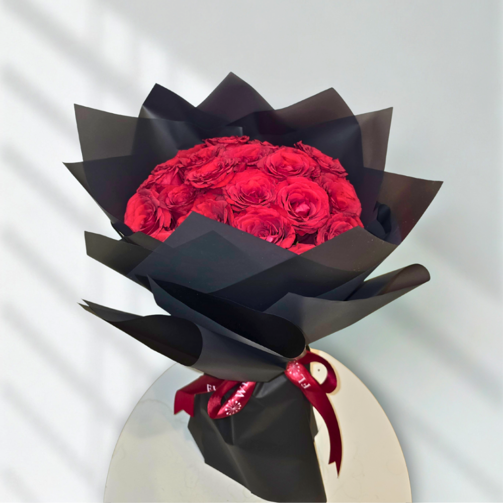 أضف لمسة من الجمال والرومانسية إلى حياتك مع بوكيه ورد احمر تغليف اسود من براند pion. اطلبه الآن واستمتع بأجمل اللحظات.
